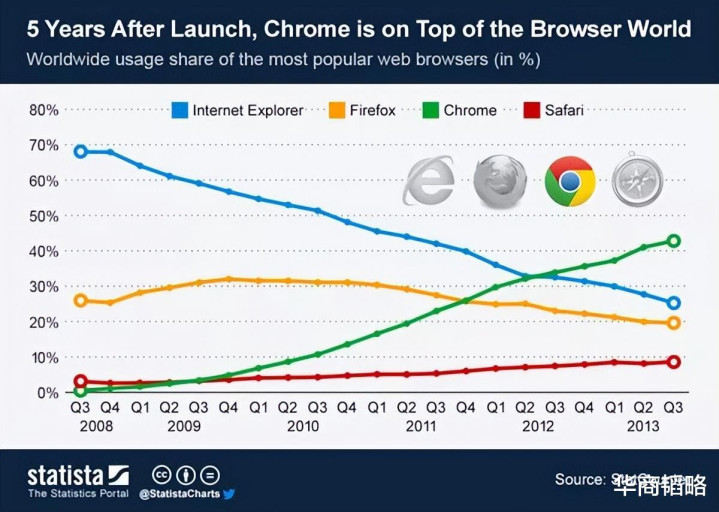 2008年9月,整合了谷歌搜索以及全家桶服务的Chrome浏览器正式上线,初始市场份额只有1%,而IE浏览器的份额是66%;五年以后,Chrome超越IE和火狐,成为全球第一大浏览器。在此期间,皮查伊也顺利进入谷歌核心高管层,出任Chrome业务高级副总裁。